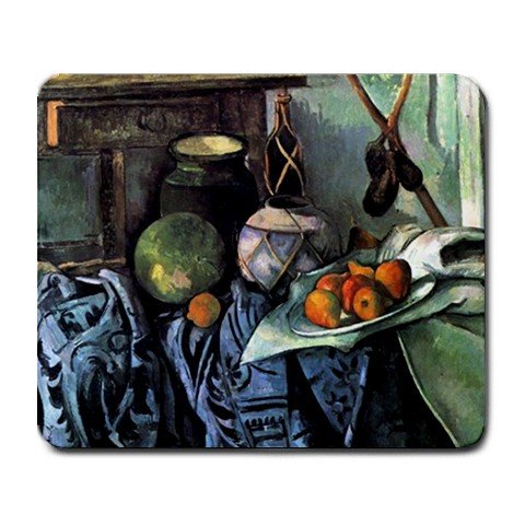 Paul Cezanne is one of the greatest French artists of all time. Paul Cezanne's work continues to display a mastery of design, color, tone and composition. His sensitive, compassionate and exploratory brushstrokes are highly characteristic and clearly recognizable. Cezanne's Still life with Eggplant by is one of the most appreciated works of his entire collection ever painted. You can now own Paul Cezanne's Still life with Eggplant on this mouse pad! The mouse pad that displays the painting of Still life with Eggplant measures at 9.5 x 8 inches and is machine washable.